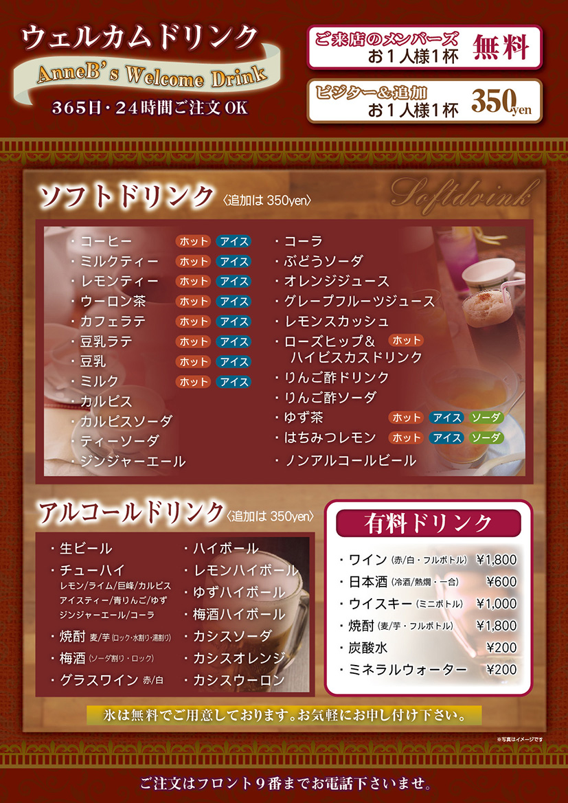 ウェルカムドリンクお一人様1杯無料サービス●ドリンクメニューはこちら |