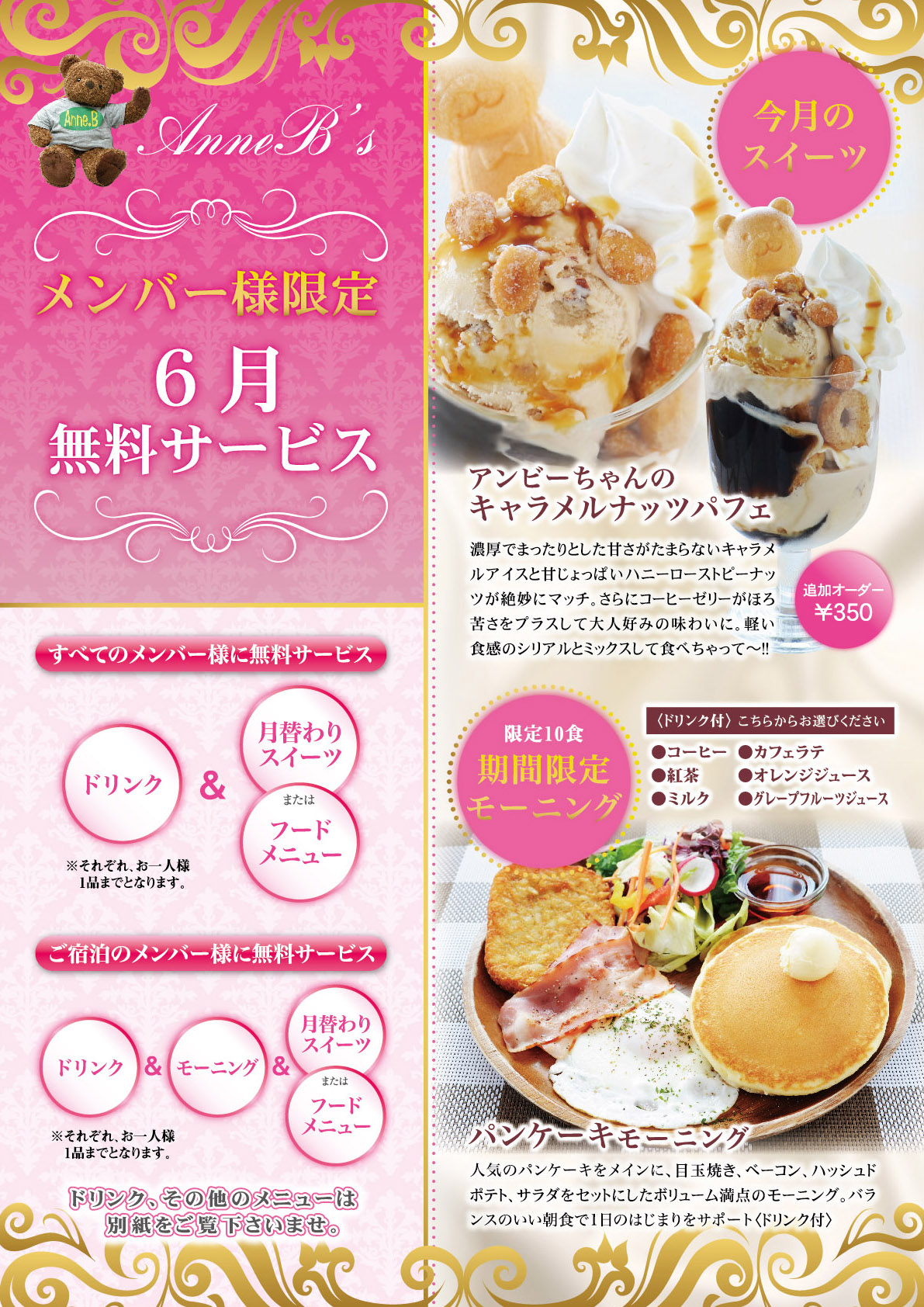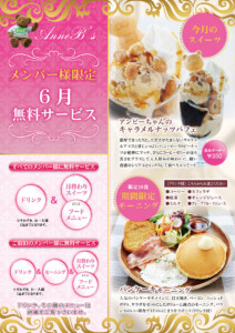 月替りスイーツ or フードメニューお一人様1品無料サービス●フードは期間限定メニューまたはレギュラーメニューからお選び頂けます |