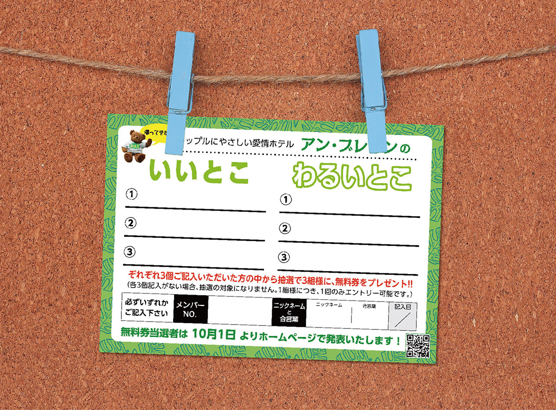 「ちょっとヤダ」や「改善して!」なところ各3個を客室のアンケート用紙にご記入くださいませ。