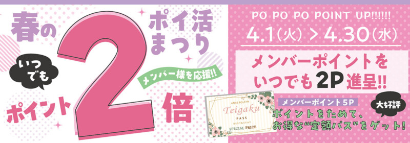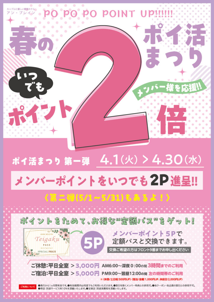日頃のご愛顧に感謝いたしまして、休憩でも、宿泊でも、いつご来店いただいてもメンバーポイントを2P進呈!