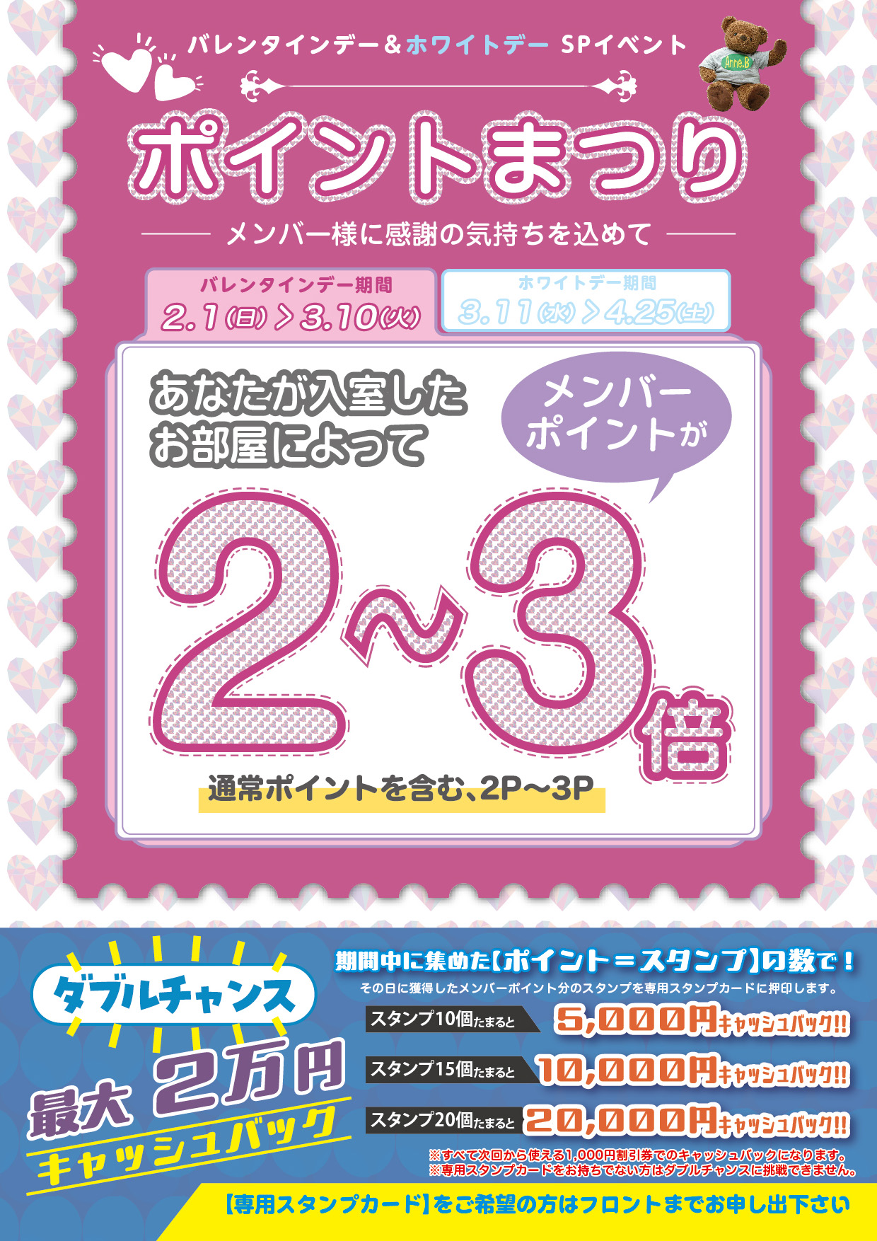ご入室したお部屋によって、メンバーポイントが2〜3倍にアップいたします!