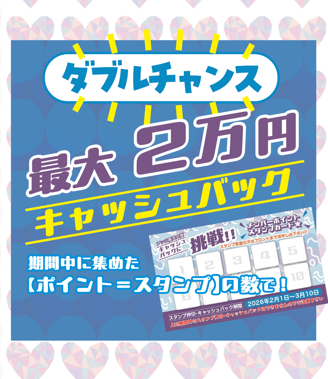 ポイントまつり実施期間中に、最短7回の来店で2万円キャッシュバックが狙える!!!!