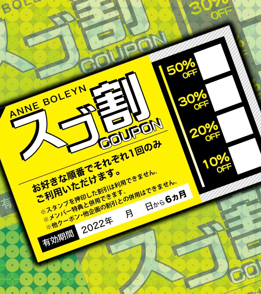 50%off、30%off、20%off、10%off をお好きな順番でご利用ください。