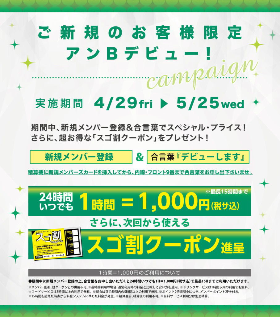 ●期間中に新規メンバー登録の上、合言葉をお申し出いただくと24時間いつでも1H=1,000円(税サ込)で最長15Hまでご利用いただけます。 ・メンバー割引、他クーポンとの併用不可。