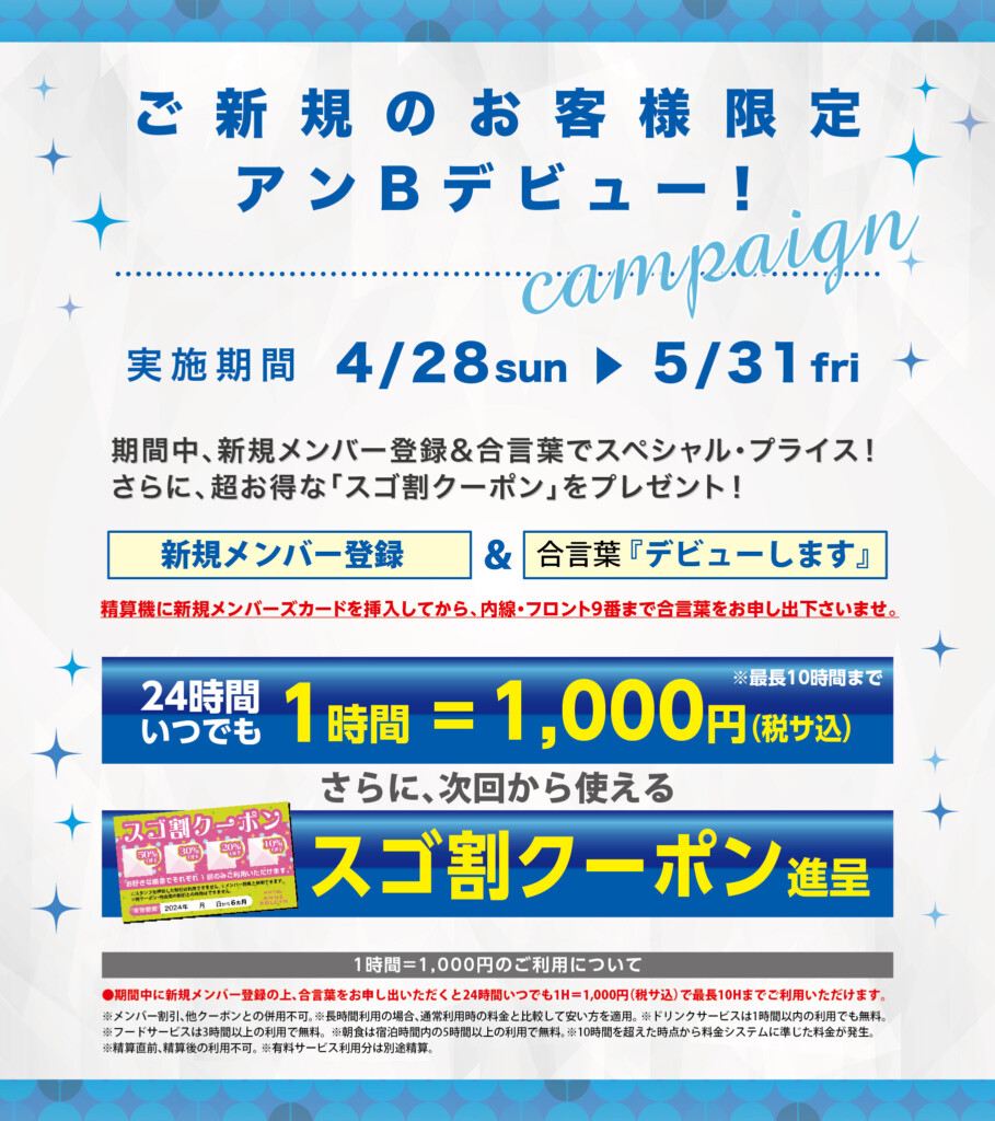●期間中に新規メンバー登録の上、合言葉をお申し出いただくと24時間いつでも1H=1,000円(税サ込)で最長10Hまでご利用いただけます。 ・メンバー割引、他クーポンとの併用不可。