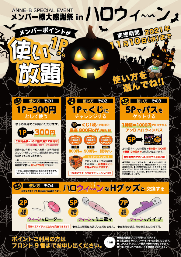 1回の上限は10時間までとなりますが、1ヶ月の有効期間内であれば何度でも使えます!●ハロウィ〜〜〜ンなHグッズと交換する!