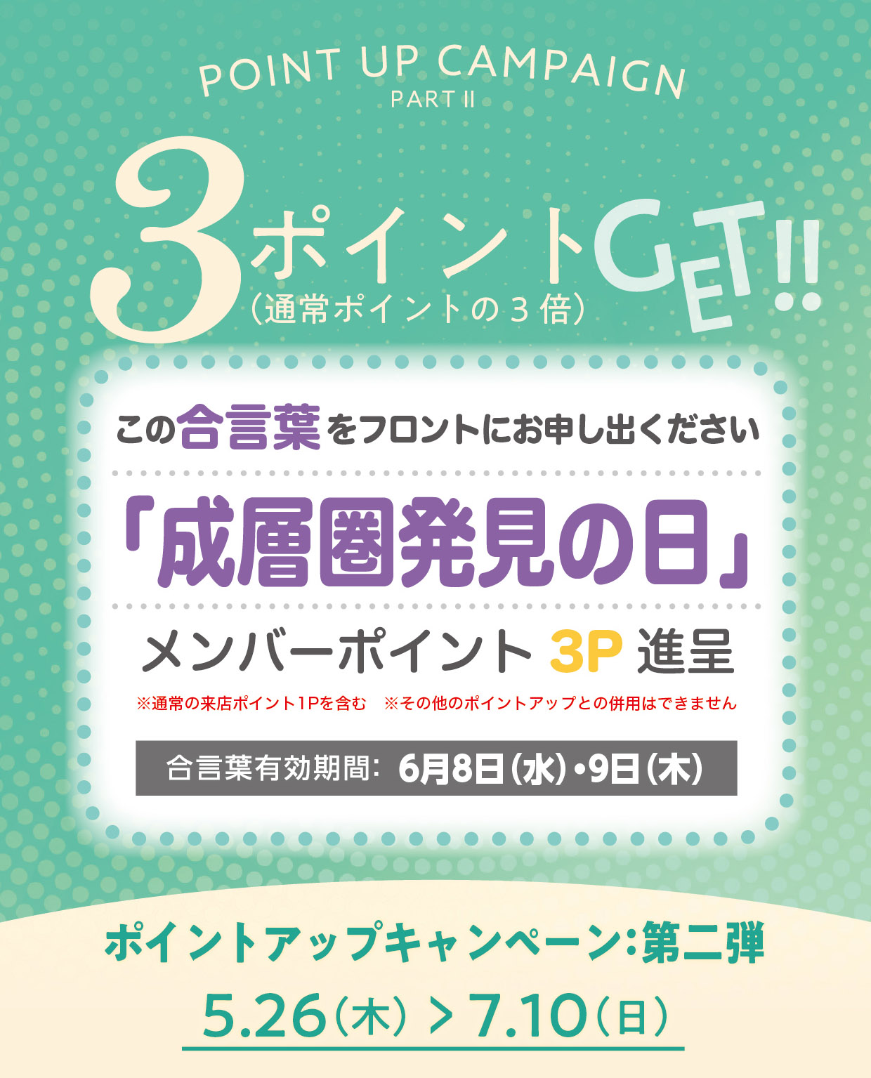 ご来店の際にお申し出いただくと、メンバーポイントを通常の3倍の「3ポイント」進呈いたします。