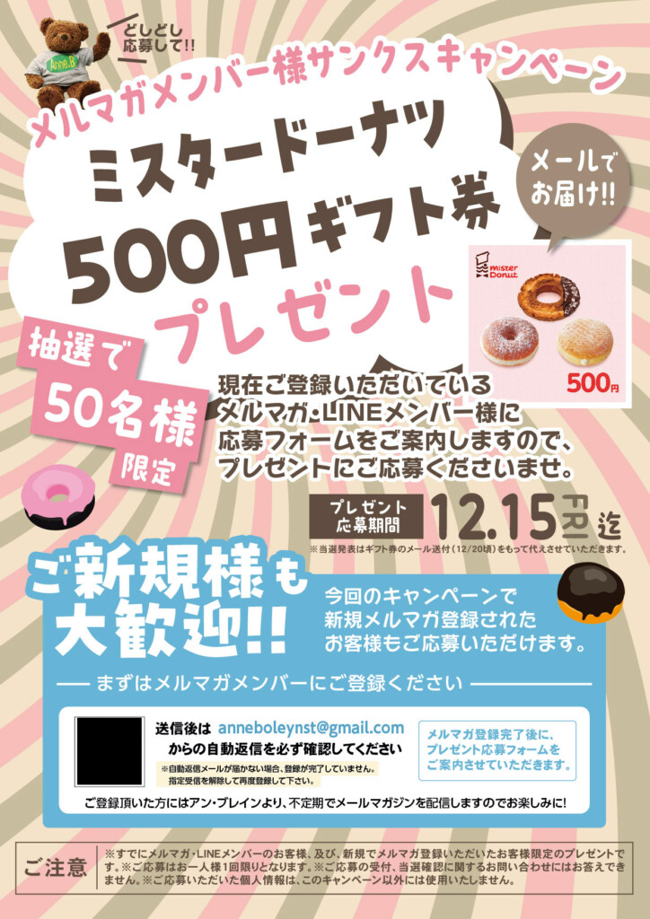 メルマガ・LINEメールメンバー様の中から、抽選で50名様にミスタードーナツ500円分のギフト券をプレゼントいたしますので、ぜひご応募くださいませ。