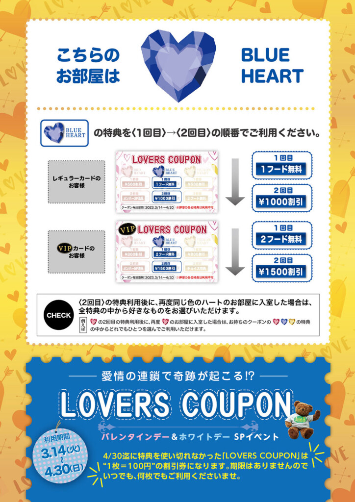 ご入室したお部屋に設置しているポップのハートの色で特典がキマる!!!