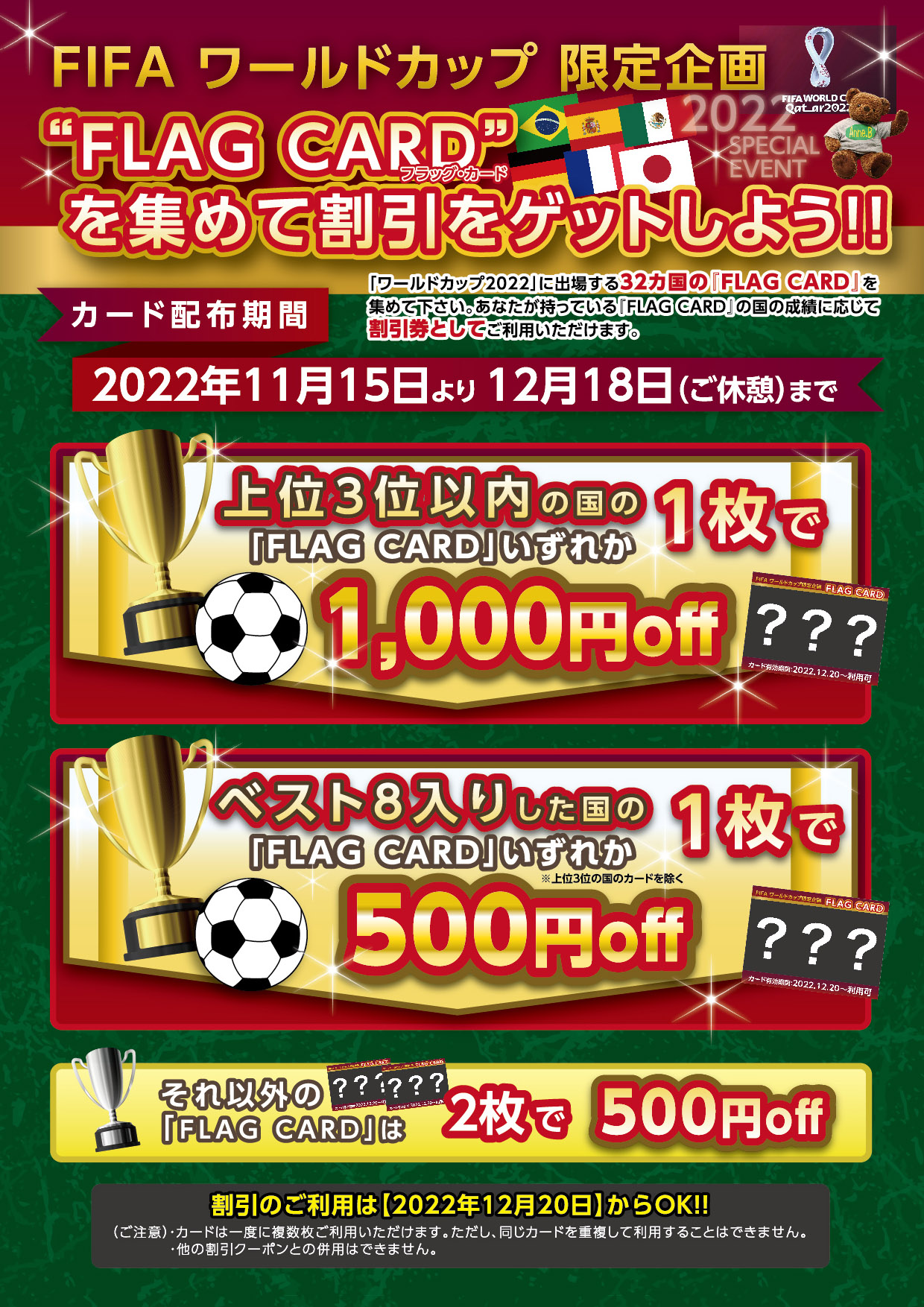 大会に出場する32カ国の『FLAG CARD』(フラッグカード)を1回のご来店につき1枚プレゼントしますのでお持ち帰りください。