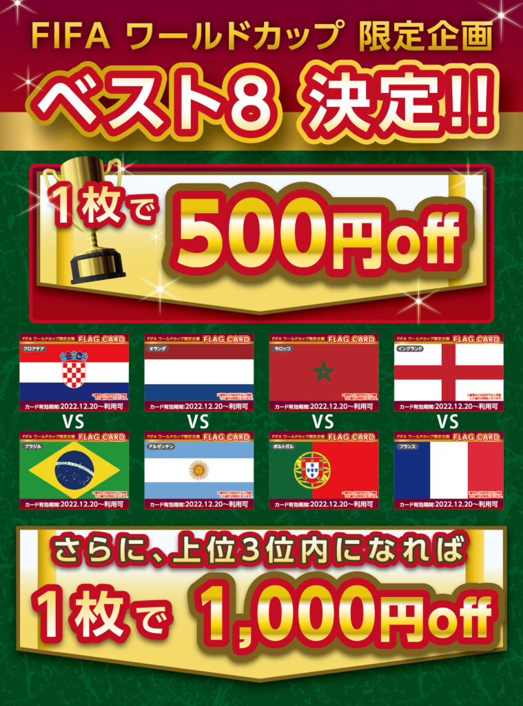 実施中のスペシャル企画で配付しているベスト8入りした国の『FLAG CARD』(フラッグカード)は、500円OFF決定です!