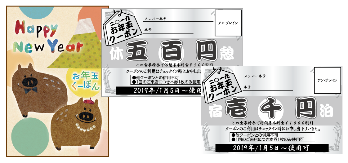 1/1〜先着200組様限定のお年玉です!休憩500円offと宿泊1000円offの2枚セット! 1/5からメンバー料金と併用してご利用いただけます!