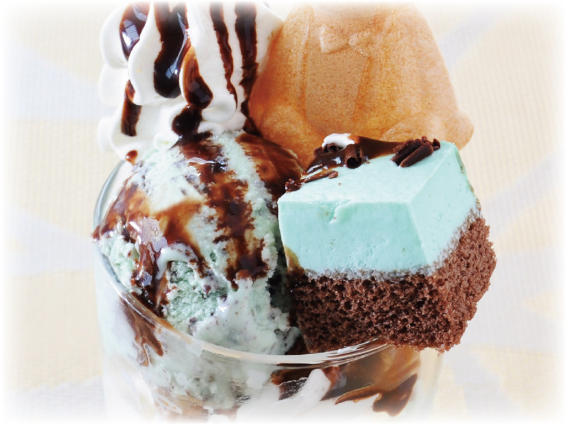 チョコミントアイスとチョコミントケーキ、さらにチョコフレーク、ミントゼリーと見た目もお味もチョコミント一色!!