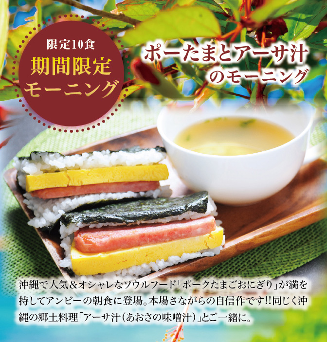沖縄で人気&オシャレなソウルフード「ポークたまごおにぎり」が満を持して登場。同じく沖縄の郷土料理「アーサ汁(あおさの味噌汁)」とご一緒に、本場さながらの味をお楽しみください!