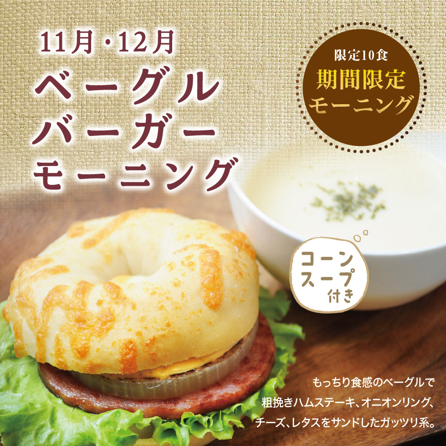 もっちり食感のベーグルで粗挽きハムステーキ、オニオンリング、チーズ、レタスをサンドしたガッツリ系。