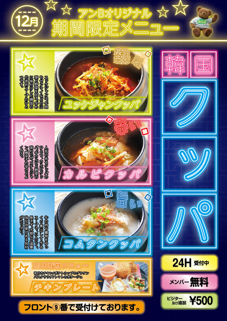 ユッケジャンクッパ、カルビクッパ、コムタンクッパからお一人様一品無料でご注文いただけます。