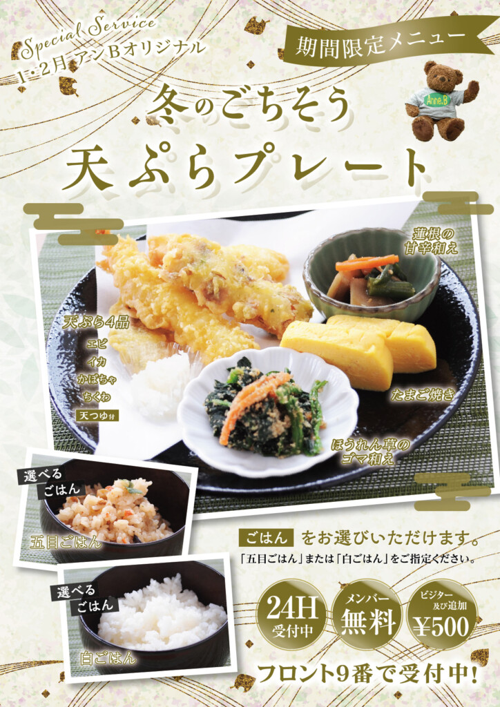 1月からスタートしたメンバー様無料の限定メニュー「冬のごちそう 天ぷらプレート」が好評です!