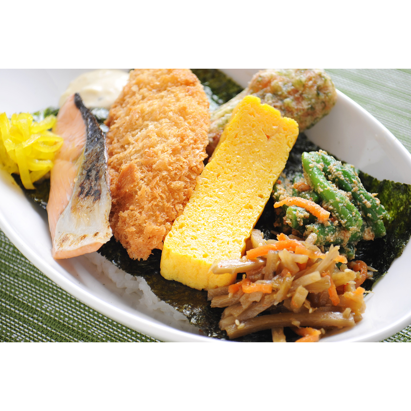 白ごはん、おかか、のりの上に、白身魚フライ、焼き鮭、厚焼き玉子、ちくわ磯辺揚げ、いんげんのごま和え、きんぴらごぼうをところ狭しとオン!
