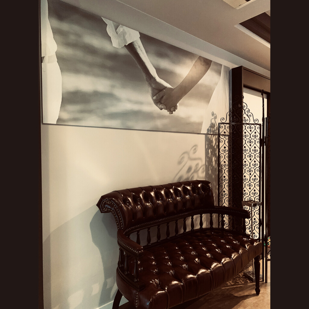 ウェイティングソファーの上にディスプレーした、オリジナルのフォトパネルがLOVEなムードを盛り上げてくれそう。
