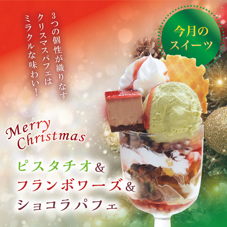 3つの個性が織りなすクリスマスチックなパフェが誕生。ピスタチオアイスのまったりとしたナッツの風味とチョコレートアイスの濃厚な甘さ。そこにフランボワーズの甘酸っぱさが加わって、今年最後のスイーツにふさわしいミラクルな味わいに。